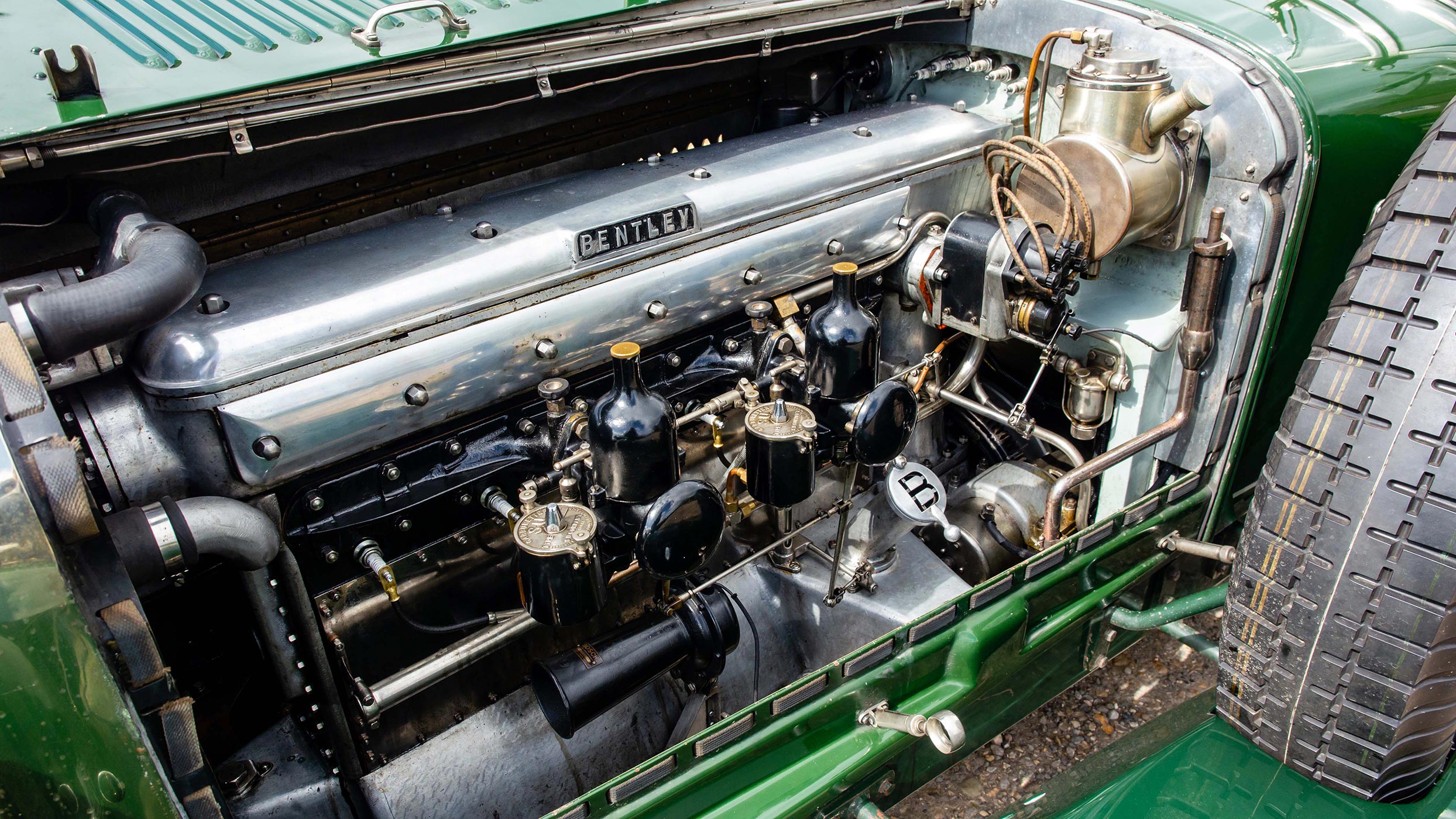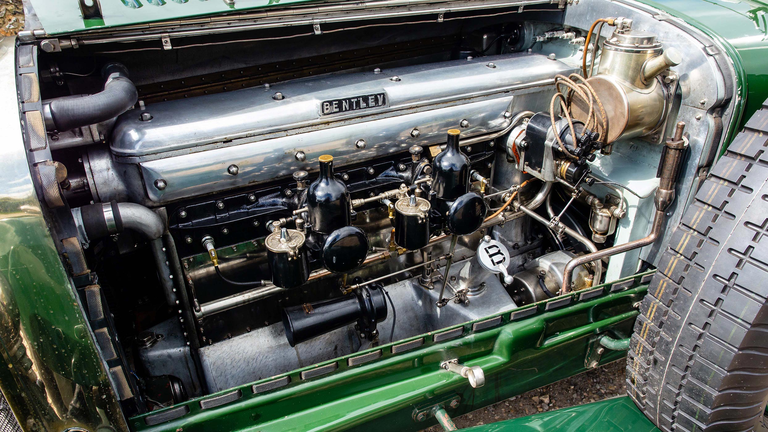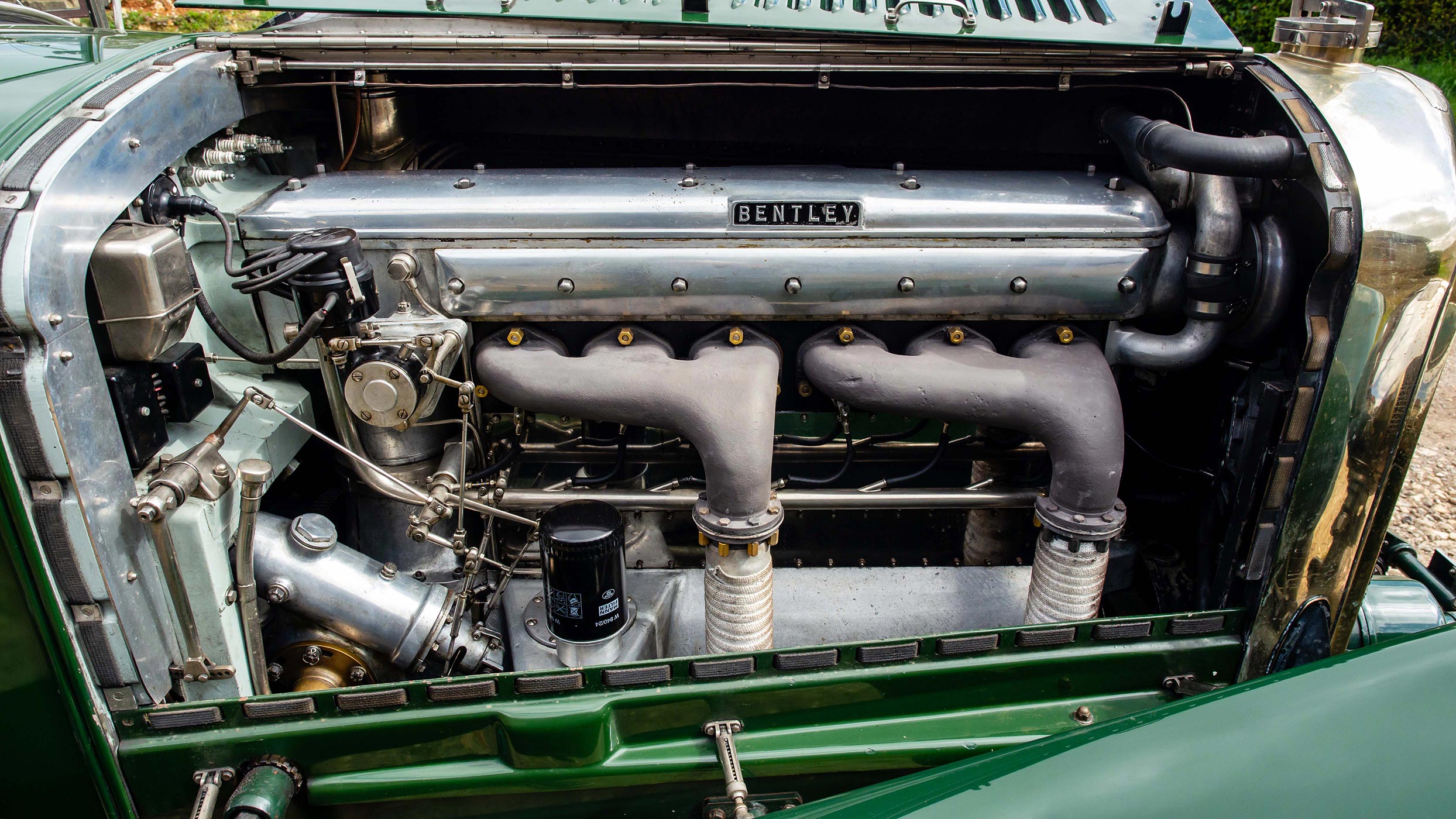 The factory service sheet records the first owner as Andre Marcel Desouttter and then subsequent owners up to 1938 as L.S. Sergeant, Stanley Hine, and E.W. Wigg. By 1978 the car was owned by Ian Rendall, a well known and highly respected Bentley Drivers Club member. By this stage the car needed a full restoration and a decision was taken to upgrade the car to full Speed Six Specification. The undertaking required commissioning new coachwork, and this part of the job was given to Roger Cook, widely regarded as one of the best Vintage Bentley restorers at the time. Since restoration TW 2705 has been a regular competitor in many prestigious international rallies and events. Over recent decades further mechanical work has been undertaken at several top level Vintage Bentley specialists including Blackmore Engineering (Tony Fabian), NDR Ltd. (Neil Davis), and William Medcalf. In total the invoices record well over £250,000 spent. The car has the latest Phoenix rods, full flow oil filtration with a modern oil filter, and overdrive. It would be very difficult to find a six cylinder Vintage Bentley that has been uprated to such a high specification and with the outstanding touring capabilities this car has.